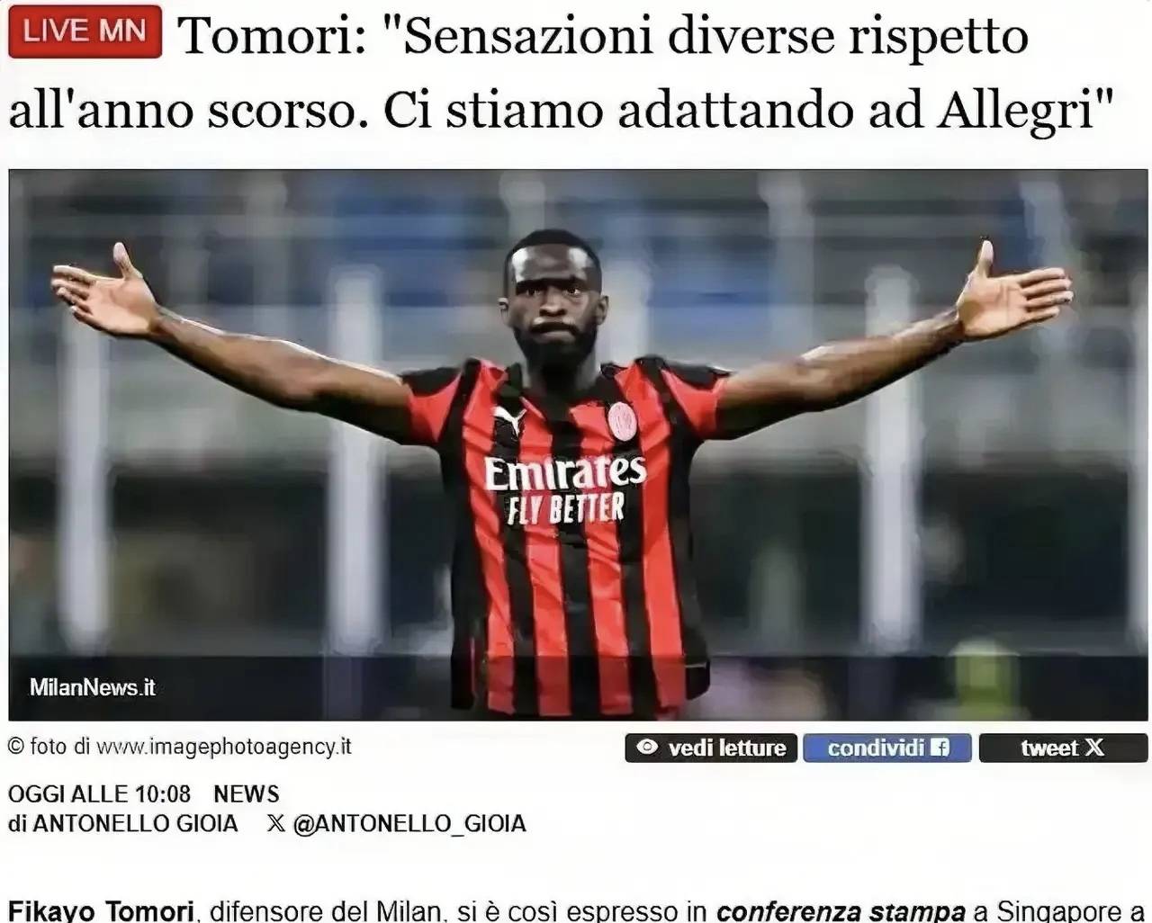 意甲:米兰球员托莫里接受采访时表示,我会努力适应阿莱格里的战术,去竞争主力位置
